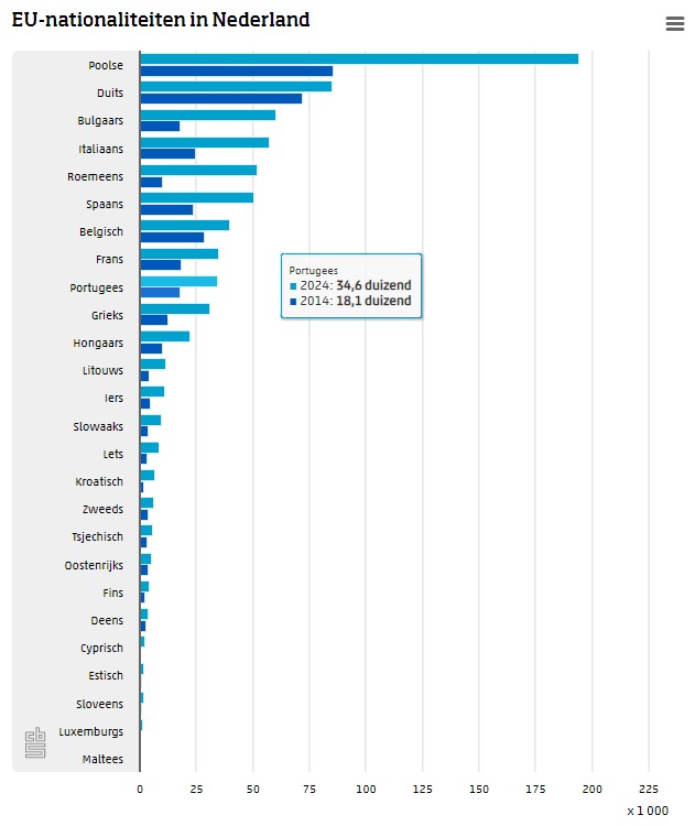 O maior grupo de migrantes da UE nos Países Baixos é proveniente da Polónia. Quase um quarto do imigrantes no país tem nacionalidade polaca. Os alemães formam o segundo maior grupo (11%), seguidos pelos búlgaros, italianos e romenos. “Em comparação com há dez anos, todas as nacionalidades da UE aumentaram nos Países Baixos no início de 2024”, disse a CBS.
